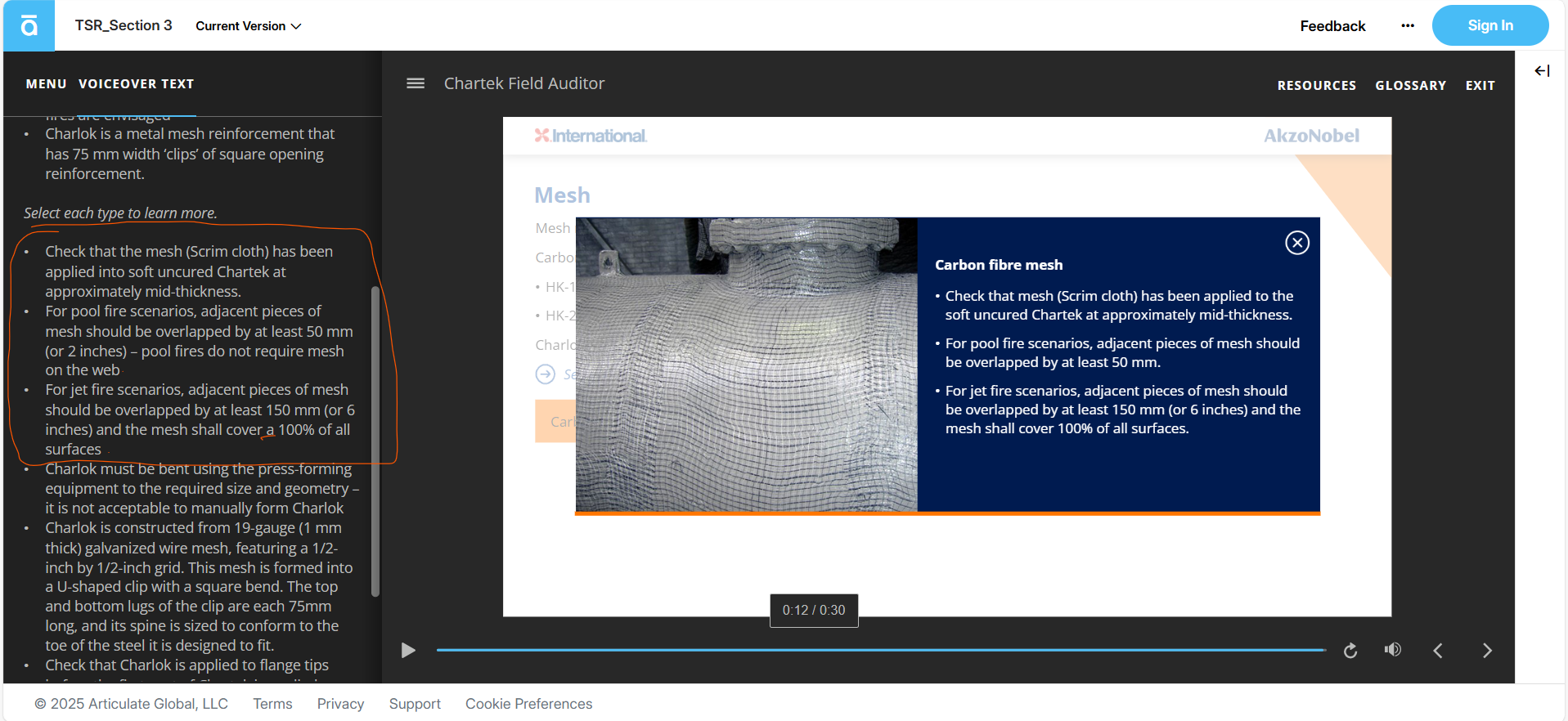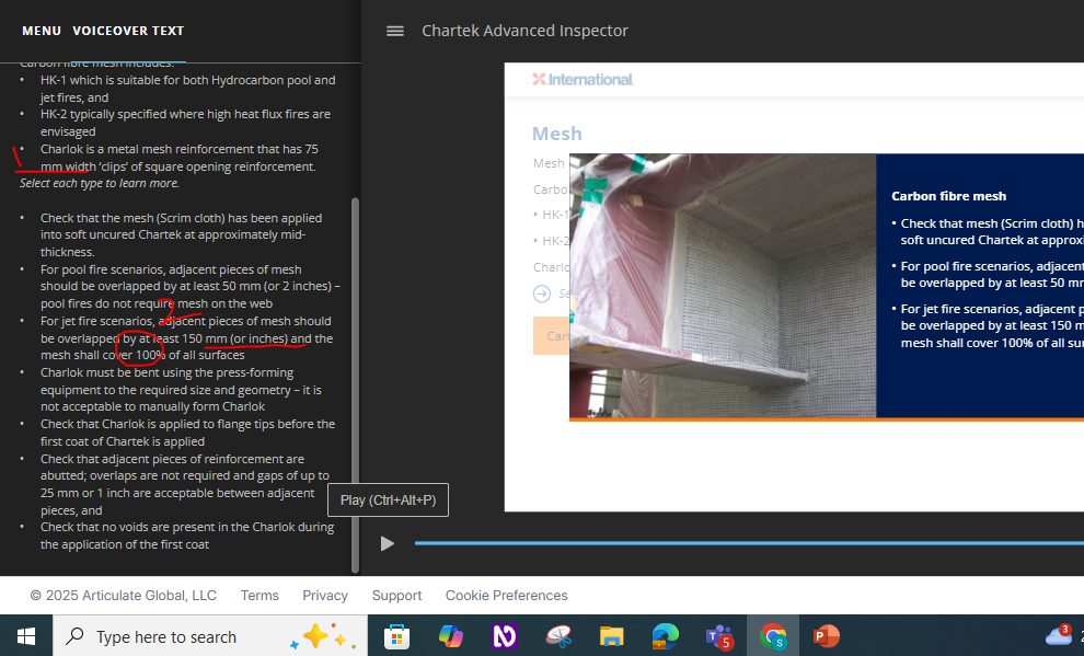 Check that the mesh (Scrim cloth) has been applied into soft uncured Chartek at approximately mid-thickness.