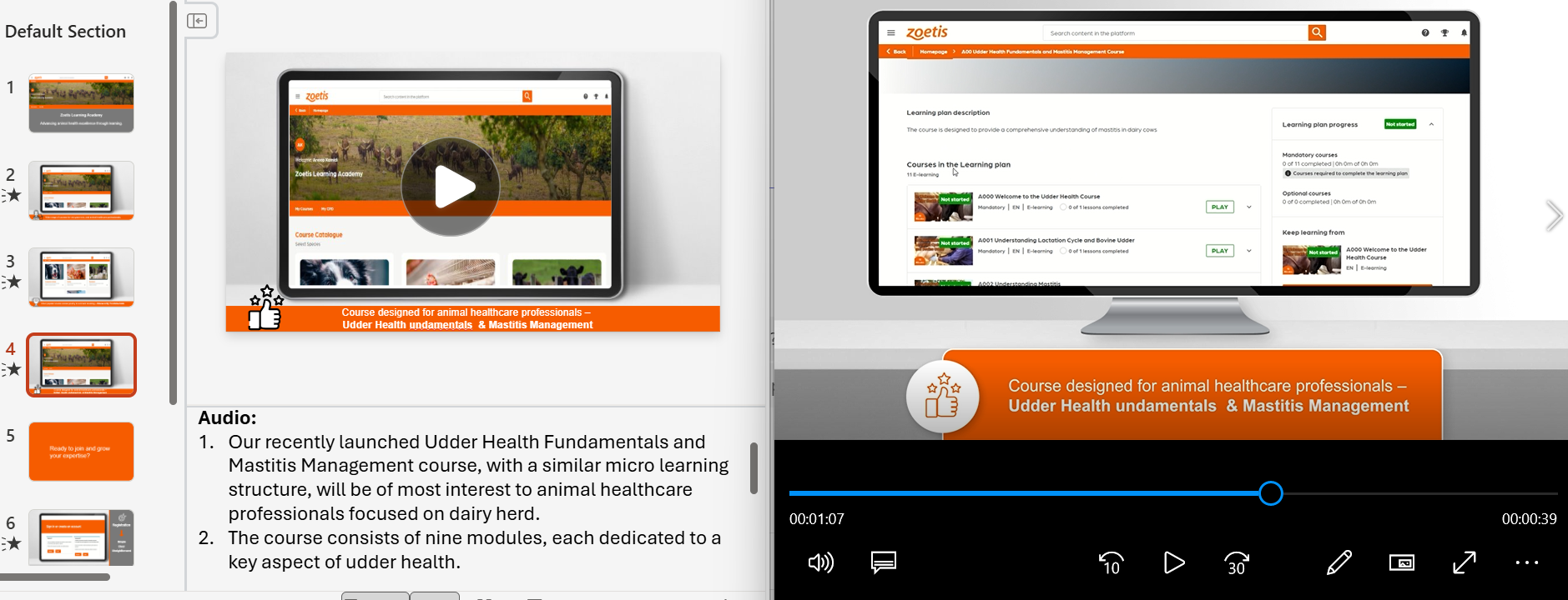 The audio mentions 9 microlearning modules, but the screen displays 11 courses, 10 modules with an assessment. Please check with Lyndon to clarify this discrepancy.